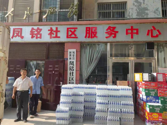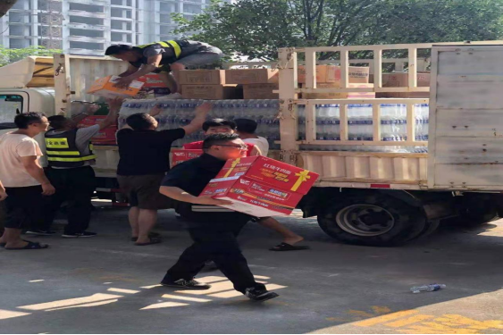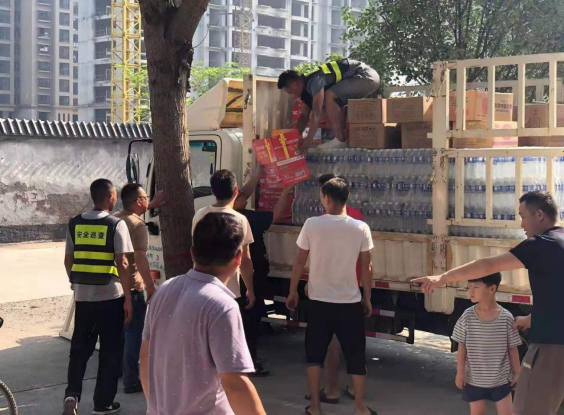 27日中午10时,收到对接救援干部的指令,要求将此次救援物资发放到位于凤泉区耿黄镇凤铭社区服务中心。社区干部介绍说该社区受淹后已经停水停电三天,急需清洁水和食物,我们的物资,解决了老乡们燃眉之急。随即我公司工作人员不顾舟车劳累与社区志愿者一起迅速搬运物资,卸下了我们满满的诚意。