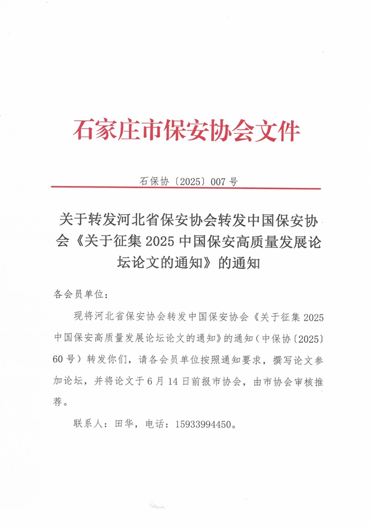 关于转发河北省保安协会转发中国保安协会《关于征集2025中国保安高质量发展论坛论文的通知》的通知