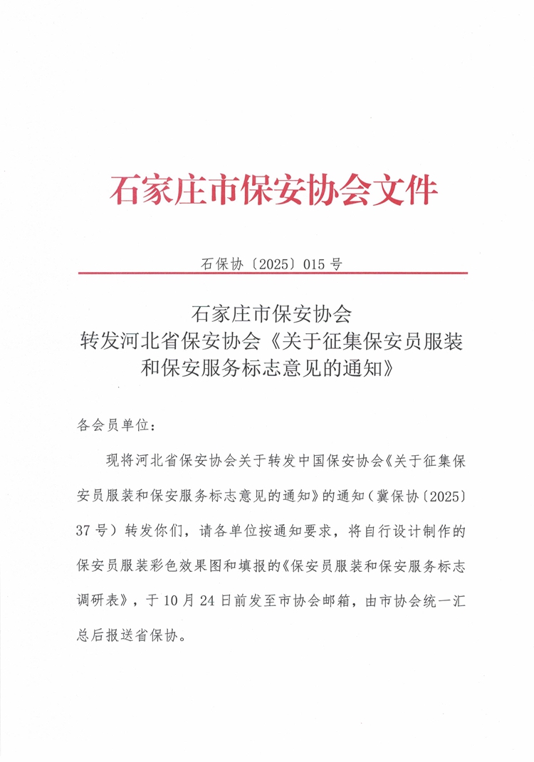 石家庄市保安协会转发河北省保安协会《关于征集保安员服装和保安服务标志意见的通知》